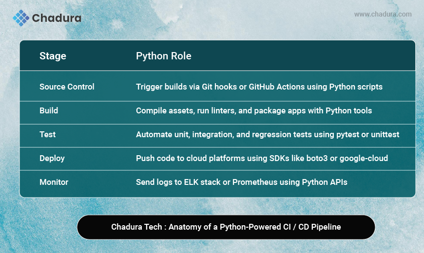 Python’s versatility makes it a cornerstone of modern DevOps. From writing tests to deploying cloud-native apps, Python empowers teams to build scalable, secure, and automated CI/CD pipelines. At Chadura Tech, we believe in blending technical precision with creative innovation. This blog is part of our ongoing mission to share actionable insights and build a community of forward-thinking developers.