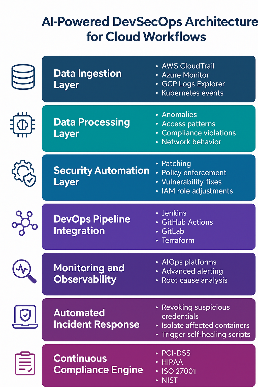 The image illustrates a layered architecture of AI-powered DevSecOps for cloud workflows. It shows how AI is integrated into every stage of DevSecOps to enhance security, automation, and compliance across cloud environments.