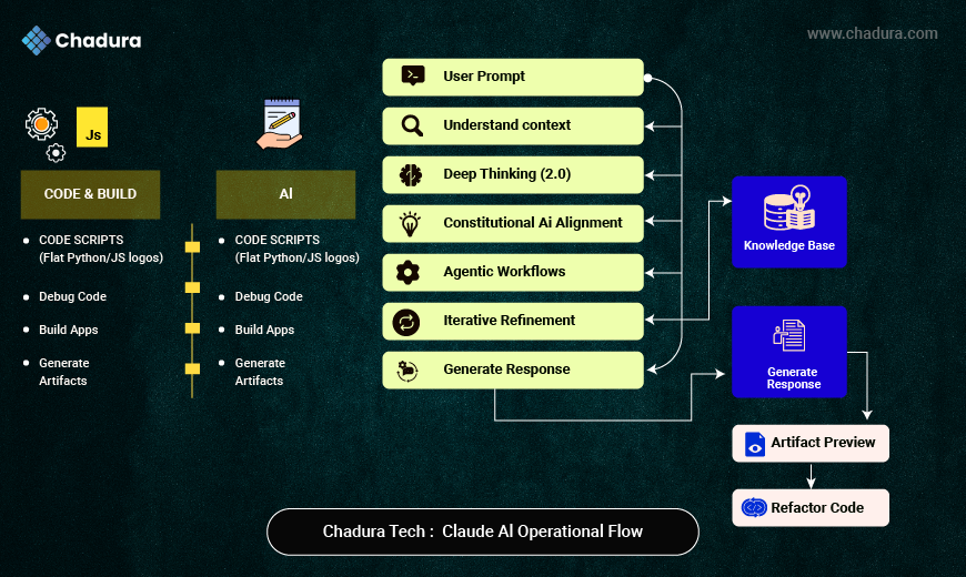 The Output Stage: After Iterative Refinement, it produces a Generated Response, which can manifest as an Artifact Preview (interactive UI/code) or Refactored Code.